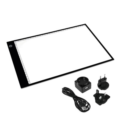 Natural daylight effect. Low heat - low energy. Touch sensitive light controls. Dimmer switch with 3 settings. USB or mains operated. Comes with an dual UK/EU plug on a 2m cable. (see video for demo of plug). Constant light across the whole panel. Non-slip feet. Lightweight. 1450 lumen. Bulb last c. 50,000 hrs. Overall size: 346 x 234 x 5mm. Lighting area: 310 x 220mm.