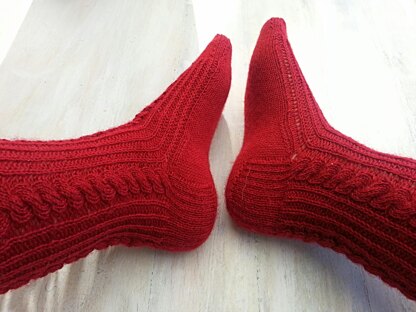 These socks are like the ones we wore when going hiking or skiing in the European Alps. I combined a cable pattern with some extra squishy half brioche stitch sections, to create a pair which has a corresponding left and right sock. They mold perfectly to the shape of the leg and foot and will not slide down, making them a pleasure to wear.