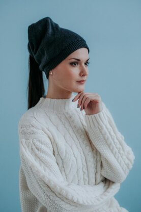 Pylos Knit Hat is double layered with a twisted top. It features a ribbed double brim, followed by a classic stockinette stitch body that is also double layered and finished off by making a twist.
