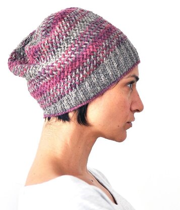 A dense and warm hat, worked in fingering weight wool with a slip stitch pattern in 2 colours that shows off slight variations in colour in hand dyed yarn. The hat can either be worn in a slouchy style with ample fit or as a beret styled hat when pushed down at the nape (directions are also given for a shorter beanie style hat, if you’d like a snugger fit).