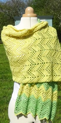 This luxurious wide wrap has a chevron design and is made from the centre back starting with a row of squares. This construction results in both edges of the wrap being identical.