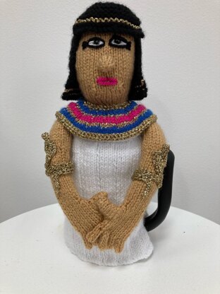 This is an Egyptian Queen cafe-cosy to complement my Tutankhamun Egyptian Pharaoh Tea Cosy made using the same yarns for the Pharaoh. Its an easy and quick knit with some DPN and i-cord knitting for the more accomplished knitter in the hand with fingers, but an easy mitten hand for the beginner.