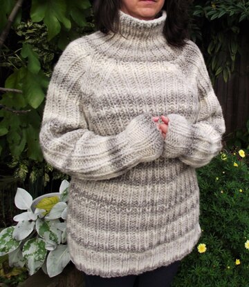 The tension used for this design is different to standard super chunky tensions, this is deliberate to give a better knitted fabric for this ribbed sweater. The pictures show the 40-42 size, photographed on my UK size 14 daughter, who loves oversized sweaters.