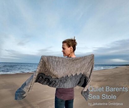 Quiet Barents Sea is large rectangular stole made in two colors. It has central twisted stitches pattern which reminds of big yet peaceful waves and small textured patterns all over the sides. The borders are simple garter stitch.