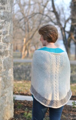 Knitted mostly in stockinette stitch, the shawl has a simple cable panel down the center that flows into a cabled edge. Quiet Life is worked from the top down like a standard top down triangular shawl; however, the center cable panel changes the shape of the shawl to a rounded triangle/half-circle.