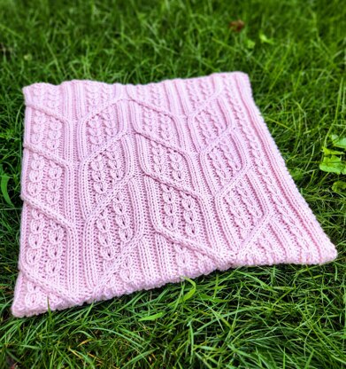 Quietude is a modern spin on the traditional cabled blanket. Cables flow in and out of ribbed columns, creating chevrons across the surface of the blanket, while eyelet cables lend a more delicate feeling to the finished fabric. Garter stitch ensures that the blanket edges lie flat. A solid or mostly solid color of yarn works best to highlight the rich texture in this design.