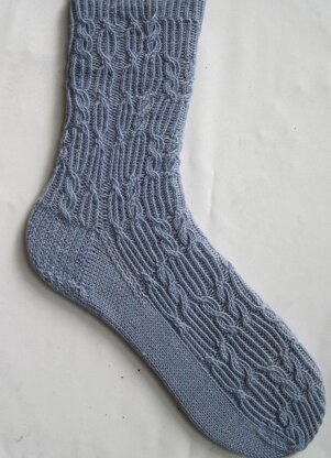 This is a pattern for a pair of socks that is knit from the top (cuff) down on two circular needles, with an optional 12-inch needle. The socks themselves are created using a single very ornate cable stitch that is quite unique insuring that cable knitters will love them. The cable stitch comes to us from the Japan. The cables add both a little warmth and durability to the socks, as well as show off your knitting prowess. The cables make quite a statement. They are a fairly “muted” cable that works very well with socks.