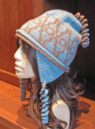 In addition to the stranded pattern, this hat has a number of interesting details: a double rolled edge, garter stitch earflaps, and corkscrew tassels (any or all of which may be easily omitted). Quotidiana is worked in the round from the bottom up, with the contrast rolled edge and earflaps added afterward using picked up stitches (no sewing required). Shown in gently contrasting yarn colors, which give the stranded pattern a shadowy effect, this hat would also be striking worked in two strongly contrasting colors.
