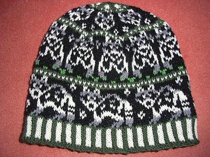 Cute raccoons directly looking at you are all around this beanie! The hat has a two color (corrugated) ribbing, followed by the side view of a cute raccoon and tiny border (peerie) pattern and another raccoon from the front. At the top are 6 raccoon faces and some raccoon paw prints that looks from the top like a flower.