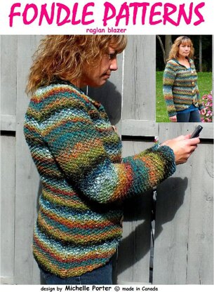 This seed stitch blazer is instantly recognisable as Noro yarn. It’s done in IRO, which is 75% wool and 25% silk. I knit the body one piece and added the sleeves to finish the raglan shoulders and collar. The button loops are added after, so you can choose as many buttons as you like. Size small to 2X-Large. This is the medium and needs only 7 skeins. Any firm bulky yarn would work well, But I designed it one piece to take advantage of a self striping yarn.