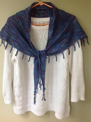 On one side, raindrops adorn the center panel on a reverse stockinette background with reverse stockinette side panels. On the other side, gentle waves are centered by eyelets on the center panel with stockinette side panels. Beaded tassels and fringe complete the look.