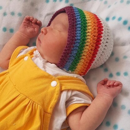 The bonnet is worked on three parts, first the crown part that is worked on rounds to make a circle. Then, the flat part with some rows of white yarn and finally, the last part are the rainbow rows that are the same for all the sizes.