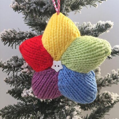 This Rainbow Festive Star will add some bright cheerful colours to your Christmas tree. This is also a super little project to practice increases and decreases, and mattress stitch seaming. Each of the five star points are knitted separately with some basic increases and decreases, then sewn together to make a star shape. Two stars are then sewn together to make the hanging decoration. Designed by Amanda Berry @fluffandfuzz, the star is knitted in acrylic DK yarns on single pointed needles (not in the round). For beginners and above, other techniques used include casting on and off, knits and purls.