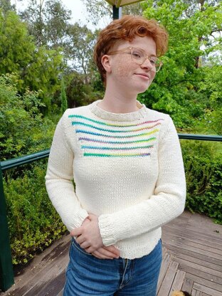 This is a Stocking/Stockinette Stitch Pullover with shaping from waist to bust, with an intarsia stripe feature across the chest, in Lily Sugar’n Cream Solids & Denim or any other Worsted/10 ply cotton yarn and a contrasting stripe in Lily Sugar’n Cream Ombres or any other Worsted/10 ply cotton yarn. It is worked flat from the bottom up and seamed. This is a quick knit, being plain and using 10 ply yarn.