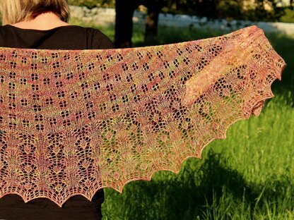 Beaded crescent-shaped lace shawl. The size of this shawl is adjustable. Yarn: Bilum Hand Dyed Yarns Merino/silk lace (filisilk), 70% merino, 30% silk, 600 meters (656 yards) / 100 g, 1 skein