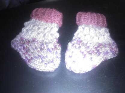 These are baby booties I designed in honor of a friend's new grand baby! They will fit a newborn but are adjustable to different sizes, simply knit the foot longer as needed. I used less then one color repeat for each bootie so you could easily get many booties from one skein, or make the matching bonnet!