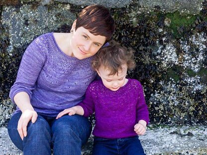 The child sample is shown in SweetGeorgia Tough Love Sock in ‘boysenberry’, ladies sample shown in SweetGeorgia Merino Silk Fine in ‘mist’.