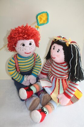 Rainey and Rainbow Ragdolls are the cuddly soft dolly that every little girl (or boy) dreams of having and will never forget when they grow up. I know because I had a Ragdoll when I was a child and here I am designing Rainey and Rainbow in memory of my beloved toy. This set of Rainbow and Rainey features two rag dolls that are knit in one piece. The arms are knit and set into place as you knit upward from the sneakers to the head. The blue jeans and the flared skirt are added last and can be removed if desired. All directions for the creating of the hairdos and the accessories are included in the pdfs. Sold at a reduced price if you purchase the two pdfs, this set of rag dolls is sure to delight young and old.. and what is better yet, they are easy to knit, and easy to add your own flair to the design. Both are knit in Baby yarn with hair done in dk and bulku.