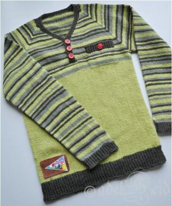 Raitaressu is a timeless pullover in fingering weight yarn, that is comfortable to put on under outwear. This striped pullover is worked top down in one piece without any seams. V-neckline continues as a short placket with three buttons. As a small detail there is a pocket on left side of the chest that also has a button.