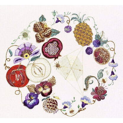 Finished design size 5.5" x 5.5" (14cm x 14cm ). Kit contains complete instructions and a stitch guide, outline printed fabric, backing fabric, needle, wire, gold sadis, gold thread and Rajmahal Art Silk threads.