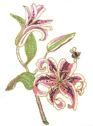 Finished design Size: 15 x 21cm. Stargazer Lily Flower goldwork & embroidery kit. Kit includes: Fabric Size: 36 x 36cm, Rajmahal Art Silk threads, Rajmahal Sadi threads,1mt Gold Rajcord, 15mts Gold Handsew Thread, Needles, Beads, Wire, Felt, Organza fabric, Vilene and full instructions.