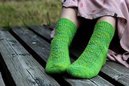 Rakas is toe up sock featuring a delicate lace and twisted ribbing pattern on the instep. After the heel, the pattern is worked around the leg before transforming into twisted ribbing for the cuffs. The pattern calls for beads added on the go but you can easily omit them if you don’t like to work with beads.
