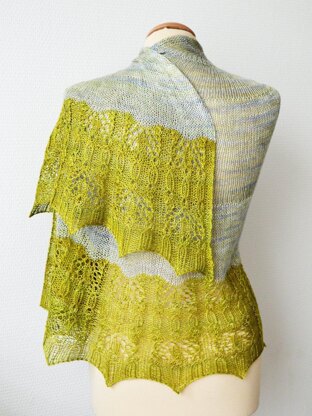 The Ramalina shawl, named for the greenish lichen, was inspired in both construction and coloring by this wonderful part of nature. The plain stockinette body lets the subtle variegation of the silk yarn used really shine.