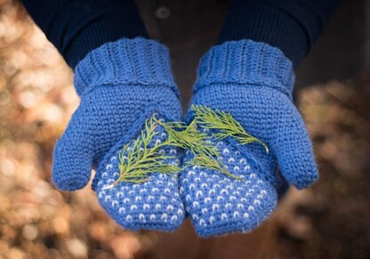 These cosy mittens are worked from the cuff, which is worked flat then seemed. Stitches for the body of the mittes are worked in raw ends of cuff, which is worked in waistcoat stitch. The colourwork pattern is worked using Fair Isle technique. The stitches are picked up for the thumb at the end.