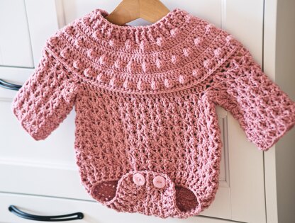 Raspberry Romper is worked top down. You start with the yoke, the collar is worked later. At this point it is very important to make sure you are working foundation chain loosely to make it elastic so that the child’s head passes through easily. Normally, chains are not elastic, for this reason you need to work them loosely. At first they might look too loose and not pretty, but it will be all fixed when the collar is made. This romper has long sleeves and it’s very suitable for colder days.