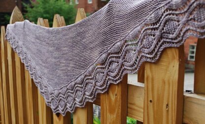 The shawl starts with the cables-and-lace edging, which is worked back and forth. Then stitches are picked up along the side of the edging and short rows are used to create the body of the shawl. Finally, a two-stitch modified I-cord bind off finishes the top edge.