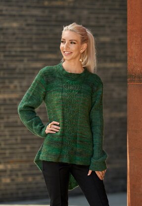 Ravna is an historic name from northern Norway, her charisma is given to this a-line pullover with a longer flowing shirt tail back. A cable medallion adorns the spine which is crowned by a high garter stitch collar. All the sides are marked by a strong garter stitch edge presence. Ravna is knitted in a divine hand dyed shade from Værbitt called Little Parsley based on a childrens’ rhyme on Sølje Pelsull from Hillesvåg Ullvarefabrikk.