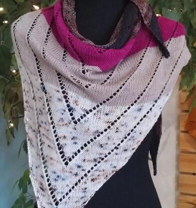 This triangular shawl is knit from the bottom up, with a repeating eyelet lace pattern forming a series of V-shapes. Repeat the motif as many times as you wish to obtain a small shawlette or a large shawl.