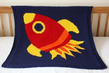The Reach for the Stars blanket is knitted from the bottom up, with a moss stitch border that is knitted at the same time as the central panel; the rocket motif is incorporated using intarsia. The blanket is knitted in chunky weight yarn, making it a quick knit, suitable for intermediate level knitters. The blanket measures 89.5 x 95 cm (35.25 x 37.5 in) and is the perfect first blanket, suitable for use as a playmat, cot blanket, in a moses basket or on a car seat.