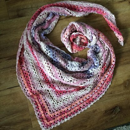 As written, the pattern calls for 3 x 100g balls of Stylecraft Sundae DK in Strawberry Dream, 1 in Blackberry Crush and 2 in Raspberry Ripple. There was a little of each yarn left over, enough for a small project or to increase the size of the shawl.