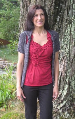 Ready or Knot is a nearly seamless cardigan worked from the top-down. The knotted upper collar adds a twist to the open style and makes the raglan construction appear to be more of a set-in sleeve. A provisional cast on is used to add stitches below the knot—these stitches are picked up once the bodice is complete, the knotted collar is worked from them, and then sewn into place along the upper neckline. Note that the pattern does not include a tutorial for the provisional cast on itself. The pattern includes instructions for both a short-sleeved, hip-length sweater as well as a ¾-sleeved, tunic length garment. Both are intended to be worn with 0-2” of positive ease at the bust, though the cardigan can easily be worn open with a bit of negative ease as well. Zero-to-positive ease will allow the wearer to pin the garment closed, if desired. Yarn choice will affect the final fabric. The shorter version (grey) was knit in a merino-cashmere-nylon fingering weight yar