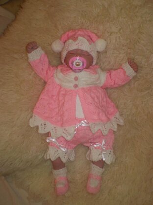 Matinee coat, Hat, Bootees & Frilly Pants - knitted in DK.