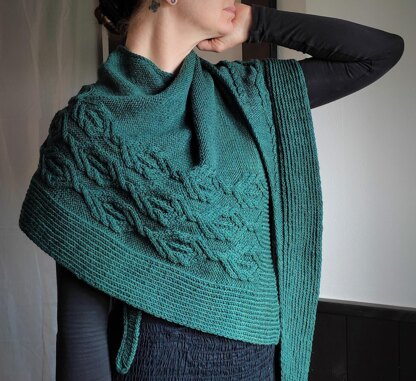 The Rebound Shawl is a big statement shawl full of character and substance. Bold, mesmerizing cables growing from tip to edge, enclosed by deeply ribbed borders, will embrace your shoulders and shield you from the cold. Worked up in DK-weight yarn, Rebound is a versatile accessory and the elongated triangle shape allows for effortless draping. Wear it with a chic dress or your well-worn leather jacket, it will be an eye-catcher and add something special to any outfit. The Rebound Shawl is worked flat from the right tip to the left edge as an asymmetrical triangle. Although increases are worked on one side only, the cleverly changing increase rates shape the shawl like a curved wing or vortex shawl for easier draping.