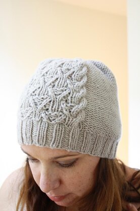 Yarn: Manos del Uruguay Rittenhouse 5-ply (100% merino wool; 241 yds/100 grams) 1 skein, shown in Natural Gauge: 18 stitches and 24 rows = 4” in stockinette stitch before blocking. Finished size: fits a 22” head Needles: 16” US 6 (4.0mm) circular needle, 16” US 8 (5.0mm) circular needle, US 8 dpn’s. Notions: 1 stitch marker, a cable needle, and a yarn needle Stitches Used: knit, purl, knit into the front and back (kfb), knit 2 together (k2tog), slip slip knit (ssk), purl 2 together (p2tog), right twist (rt), left twist (lt). All stitches are explained within the pattern.