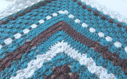 This rectangular stitch sampler is a twist on the traditional granny square pattern. It makes a great stroller or comfort blanket for a baby or small child. The project uses different stitch patterns (a granny rectangle, an alternating v-stitch, staggered puff stitches, and an edging) to keep things interesting. I’ve rated the pattern intermediate, not because it is difficult to make, but because it really helps if the crocheter is able to “read” her/his stitches when switching between the different patterns.