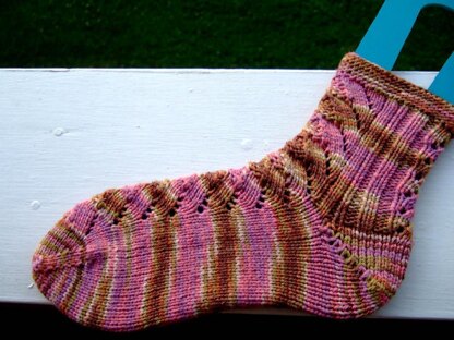 from Cristi: I found a nice stretchy lace pattern and got to work. I went toe-up so as to make the most of each skein. I came out with a nice ankle sock with some neat random ribbing separating out two different lace panels. The sock is named for my favorite British Sci-Fi comedy (because there are so many to choose from you know) inspired by the character The Cat. He used to sing to his dinner before he'd eat.