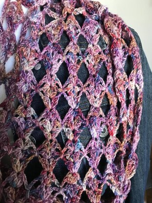 This design is a lacy and colorful cowl. It is created with repeating diamonds in three repeating rows. It is worked in one piece from start to finish, only two ends for weaving in. It is an easy pattern with a crochet seam row. Includes a chart of pattern and seam row.