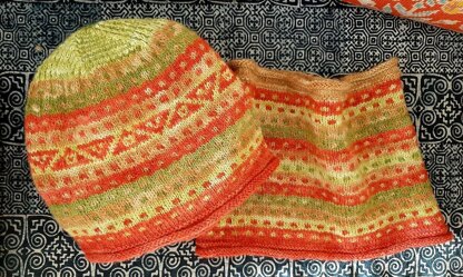 This package features patterns for both a rolled-edge cowl and slouchy hat worked in an alternating colored bands slip stitch design. Incorporated in the hat pattern is a band with a traditional Fair Isle stitch pattern.