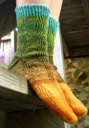 These socks are worked toe-up to use up every bit of handspun yarn. The refracting wave pattern is somewhat illusory - on the chart, it appears that the stockinette portion is wandering back and forth on the ribbed portion, but on the sock the ribbed portion appears to be wandering on the stockinette portion.