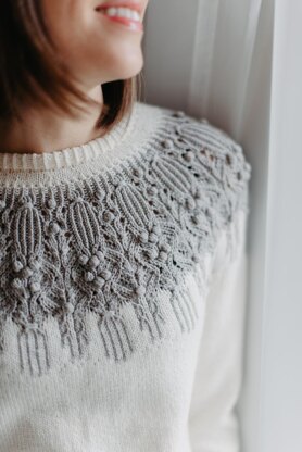 Yarns used in sample (size 2) is Bare Naked Wools Modern Deco Sport (366 m 400 yds / 115 g), 1 skein of Chrome as contrast colour and 3 skeins of Titanium as main colour.