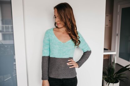 Circular yoke, v-neck, pullover sweater designed for intermediate crocheters.