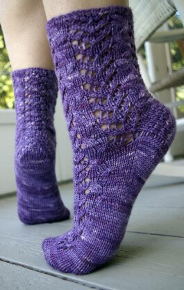 Relevé is a step in ballet in which the heels are lifted off the floor and the dancer balances on the balls of her feet. Not only is that a lovely visual for a sock, but it relates to the inspiration stitch for these cable and lace socks. The “Germaine” stitch is a pairing of a basic cable with an arrowhead lace. Germaine has a similar spelling to the word “germane”, which means “relevant” – and so, in the same way that changing a few letters leads to a completely new meaning, changing a few aspects of the original stitch leads to a charming sock! Note that the circumference of this sock is adjusted by changing needle size and gauge.