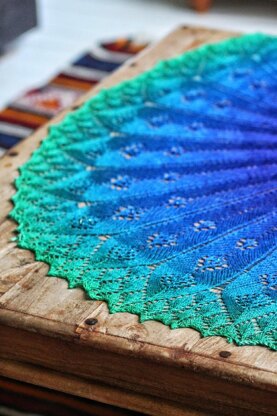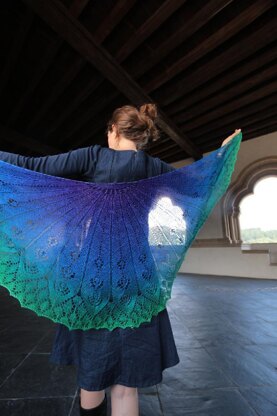 The shawl increases using a memorable and easy formula, gradually adding feather eyelets before resolving into a shower of smaller feathers in an edging that can be repeated to a much larger size.