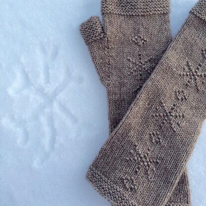 These cute mitts are quick and fun to knit. Buffalo Wool Company 2Sexy is a heavier fingering weight, so check your gauge if you choose another yarn. I do love the bison/silk blend because the sheen of the silk highlights the little purl snowflakes!