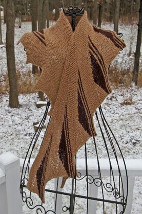 Reprise – knitted on a diagonal shawl. The shape of the shawl gives many options the way it would be worn. It could be longer or shorter to the taste of the knitter. Garter stitch makes it soft and squishy, contrasting colors give the charm. The geometric pattern along the edge, created by short rows, gives the shawl personal character.