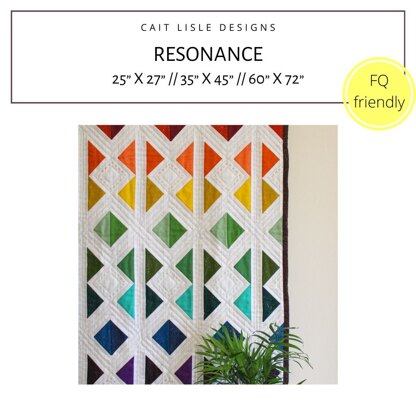 Inspired by the instant moment of joy created by seeing a perfect rainbow, the Resonance Quilt reminds us that small acts of kindness can ripple outwards to make a big impact.\n\nThe downloadable pattern includes:\n\nFull instructions for three sizes and three colour schemes - extended rainbow, monochrome and three colour ombré, plus a scrappy option\nHelpful tips and diagrams for how to piece and assemble your quilt top\nLots of ideas for different colour schemes and colouring pages to help you choose your fabric layout and colours\nFat Eighth, Fat Quarter and scrap friendly\nSuitable for confident beginners*\n\nShare your projects with #ResonanceQuilt and #caitlisledesigns!\n\n*A note on the level: the larger sizes require quite a lot of piecing so you will need to be comfortable sewing an accurate 1/4” seam and working with large numbers of small blocks.